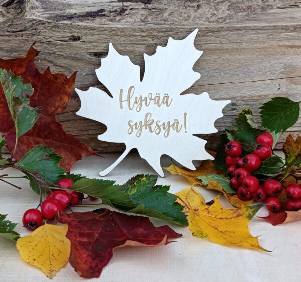 Puinen vaahteralehdi tekstillä “Hvää syksyä!” luo sisustuksen syksyn tunnelmaan.
